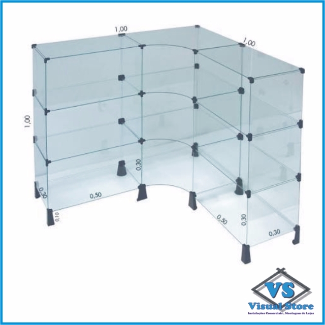 Balcões em Vidro Retos e L , Gôndolas e Piramides > Balcões em Vidro Temperado 4mm > BALCÃO DE VIDRO TEMPERADO EM L 1,0X1,0X1,0 COM PÉZINHOS FIXOS