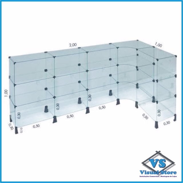 Balcões em Vidro Retos e L , Gôndolas e Piramides > Balcões em Vidro Temperado 4mm > BALCÃO DE VIDRO TEMPERADO EM L 2,0X1,0X1,0 COM PÉZINHOS FIXOS