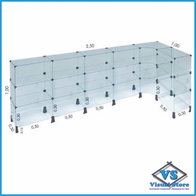 Balcões em Vidro Retos e L , Gôndolas e Piramides > Balcões em Vidro Temperado 4mm > BALCÃO DE VIDRO TEMPERADO EM L 2,50X1,0X1,0 COM PÉZINHOS FIXOS
