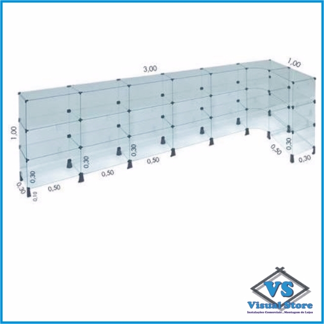 Balcões em Vidro Retos e L , Gôndolas e Piramides > Balcões em Vidro Temperado 4mm > BALCÃO DE VIDRO TEMPERADO EM L 3,0X1,0X1,0 COM PÉZINHOS FIXOS
