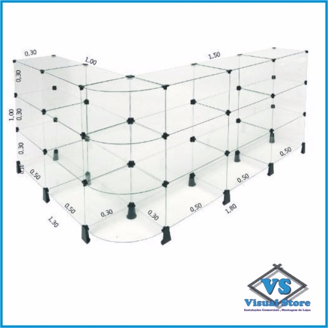 Balcões em Vidro Retos e L , Gôndolas e Piramides > Balcões em Vidro Temperado 4mm > BALCÃO DE VIDRO TEMPERADO EM L RAIO INVERTIDO 1,80X1,30X1,0 COM PÉZINHOS FIXOS
