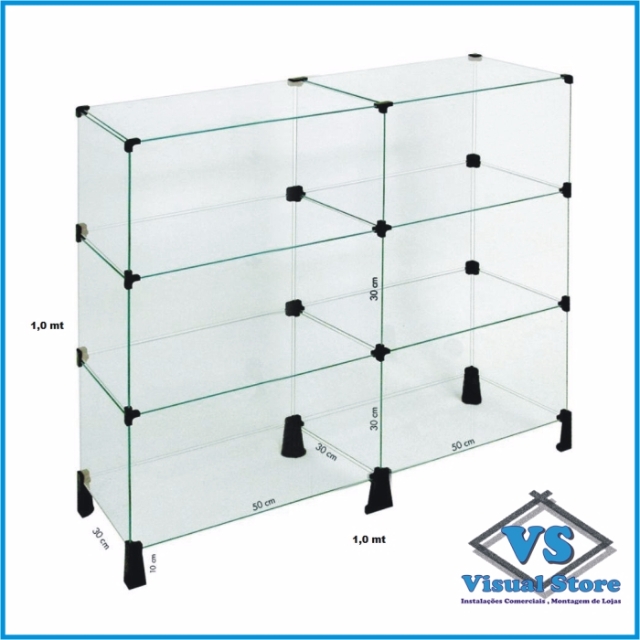 BALCÃO DE VIDRO TEMPERADO 1,00X1,00X0,30 COM PÉZINHOS FIXOS