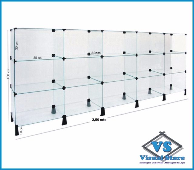 Balcões em Vidro Retos e L , Gôndolas e Piramides > Balcões em Vidro Temperado 4mm > BALCÃO DE VIDRO TEMPERADO 2,50X1,00X0,30 COM PÉZINHOS FIXOS