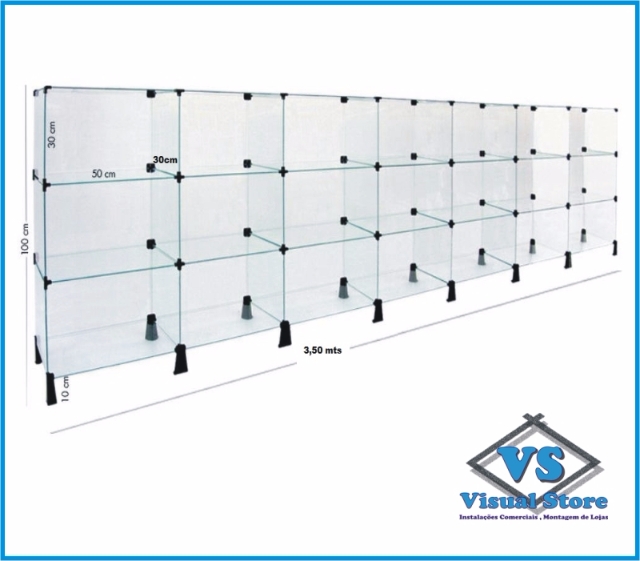 Balcões em Vidro Retos e L , Gôndolas e Piramides > Balcões em Vidro Temperado 4mm > BALCÃO DE VIDRO TEMPERADO 3,50X1,00X0,30 COM PÉZINHOS FIXOS