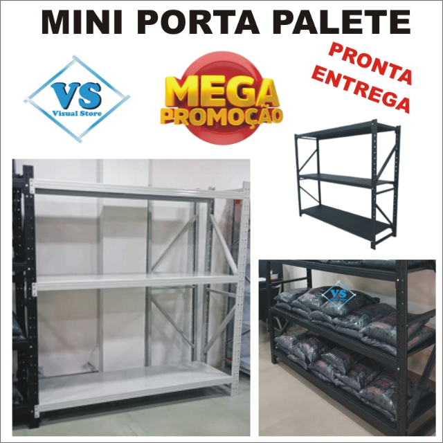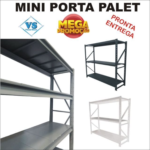 Gôndolas e Acessórios , Porta Paletes > PORTA PALETES SLIM > MINI PORTA PALLET 200 KG POR PAR DE LONGARINA KIT 1 INCIAL+ 2 CONTINUAÇÃO COMPLETO COM PLANOS METÁLICOS 2,0ALT X 3,66MTS COMP X 60CM PROF