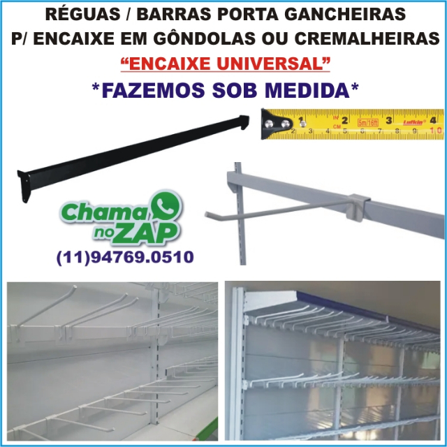 BARRA PORTA GANCHEIRAS PARA CREMALHEIRAS E GÔNDOLAS - ENCAIXE UNIVERSAL.